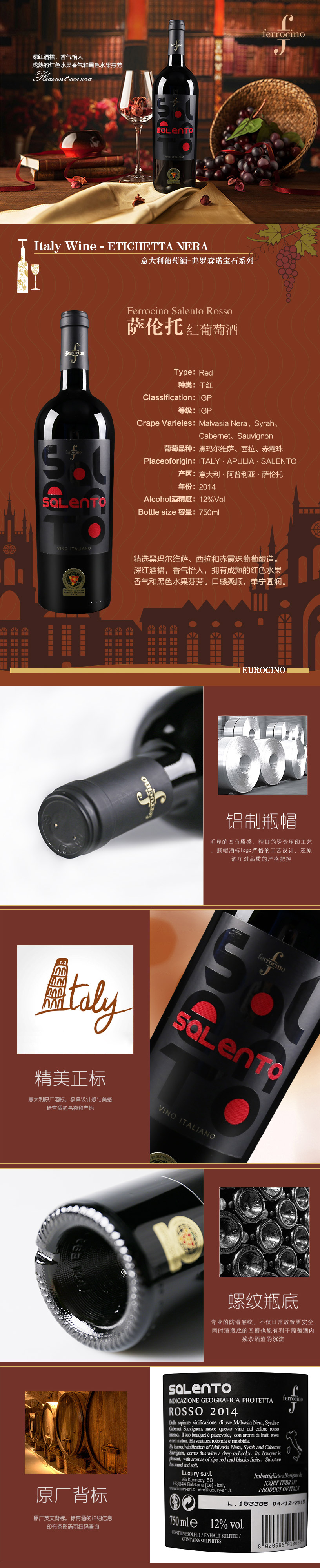 類型:干紅 產區:薩倫托 SALENTO 等級:IGP 酒莊:弗羅森諾 年份:2014 酒精度:12%vol 容量:750ml 葡萄品種:黑瑪爾維薩、西拉、赤霞珠 Malvasia Nera、Syrah、Cabernet Sauvignon 品酒師品鑒:精選黑瑪爾維薩、西拉和赤霞珠葡萄釀造。深紅酒裙,香氣怡人,擁有成熟的紅色水果香氣和黑色水果芬芳。口感柔順,單寧圓潤。